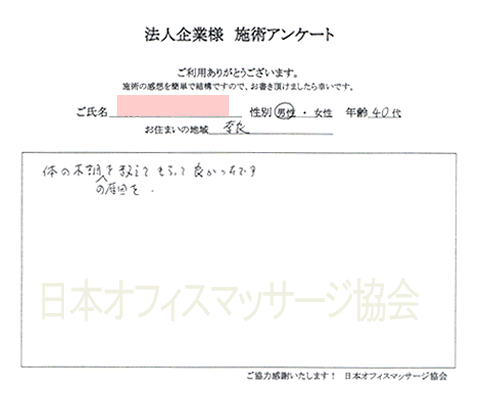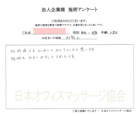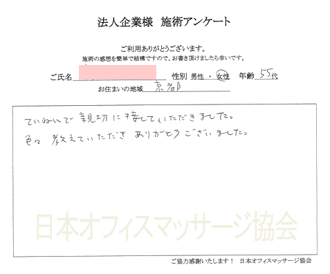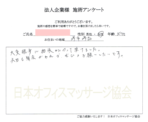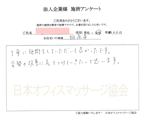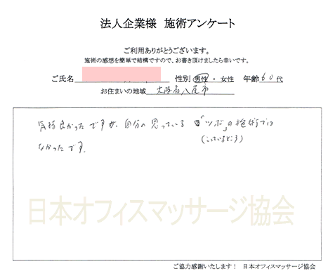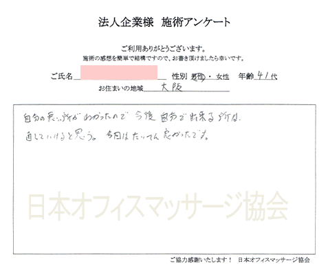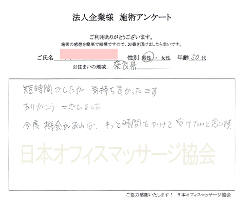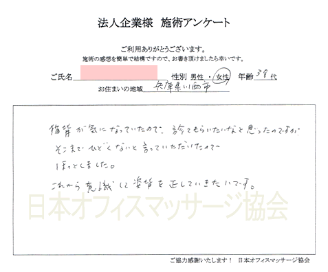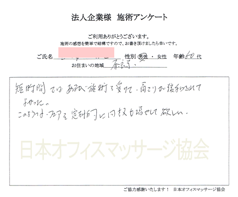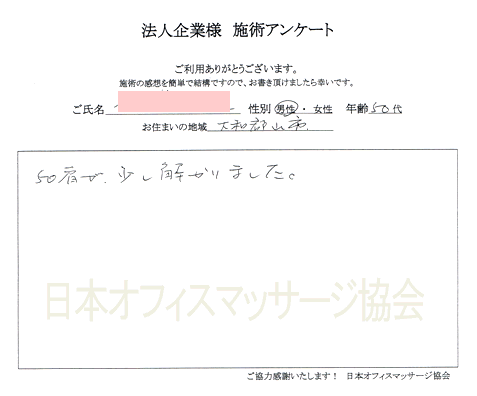 短時間ではあるが施術を受けて、肩こりが緩和されて良かった。