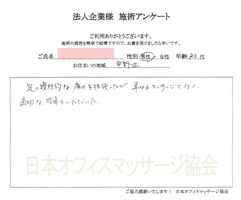 足の慢性的な痛みを相談したが、単なるマッサージではなく、適切な指導をいただいた。