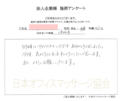 自分の悪いところが分かったので、今後、自分で出来る所は、直していけると思う。今回は大変良かったです。